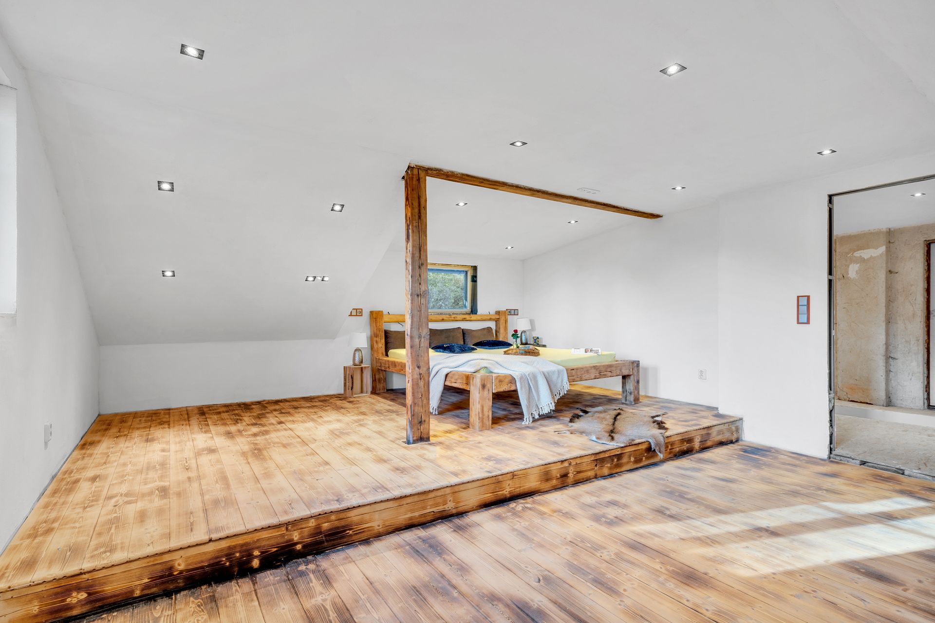 Do podkroví je zbudované nové schodiště, je zde nová prostorná ložnice a nová koupelna s WC. Zbývající část půdy je v původním